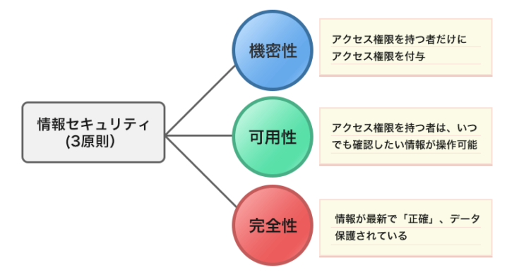 「機密性」は、限られた人だけが情報に接触できるように制限をかけること、「完全性」は、不正な改ざんなどから保護すること、「可用性」は、利用者が必要な時に完全にアクセスできる環境であることです。