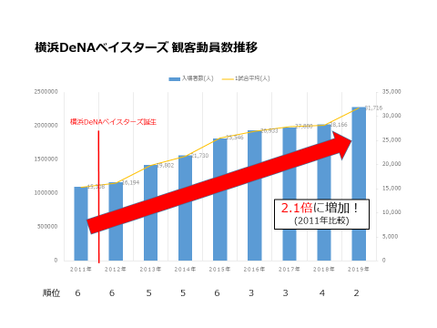 DeNAが球団を経営するようになった2012年度から、中畑清監督、アレックス・ラミレス監督というファンサービスを大切にする明るく発信力のある指揮官のもと、観客動員数が急激な右肩上がりであることがわかります。ここ数年は3位以上のAクラスに定着してきましたが、当初は最下位争いをしていたにも関わらず観客動員数を伸ばし続け、「勝たなければファンは球場に来てくれない」という古い常識を見事に覆しました。